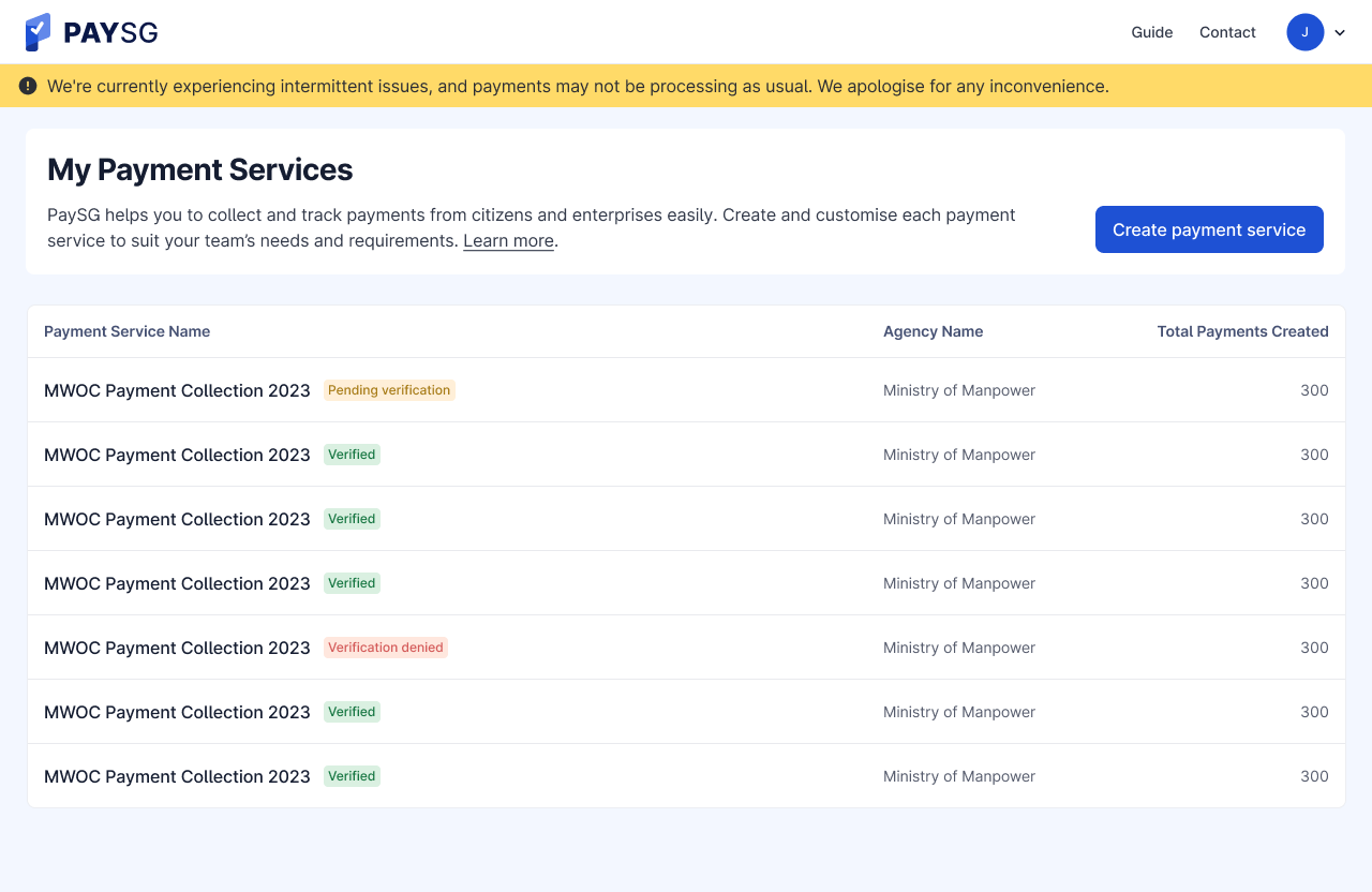 A banner will be displayed on our dashboard and payment page to inform users of the disruption, as shown below. Agencies will also be notified via email. You can also monitor our status at [status.pay.gov.sg](https://status.pay.gov.sg), and Stripe's status at [status.stripe.com](https://status.stripe.com/).