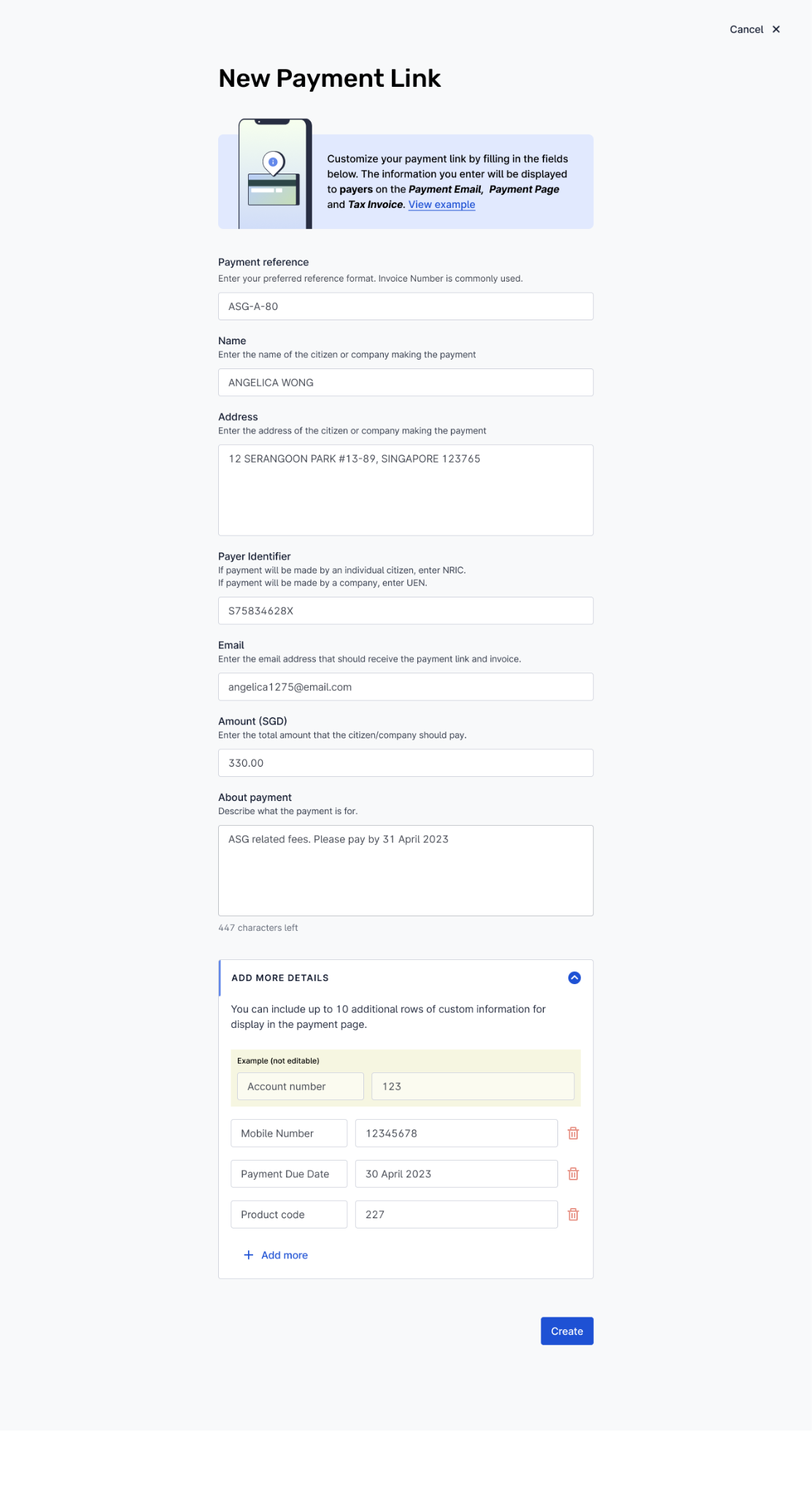 The details included in the payment link will be reflected in the corresponding receipt/tax invoice.